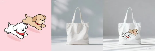 我们上传了两只小狗飞奔的图片和一张白色帆布包的产品照,并输入提示词「图 2 帆布包上印着图 1 形象」。