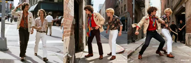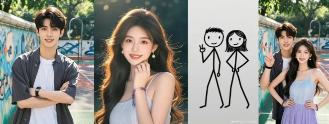 模型不仅准确捕捉了参考姿势,还能在保证两位主体身份特征的同时,实现自然的构图与表情协调。不同来源的图像在风格与细节上被平滑统一,没有出现常见的「换脸违和感」或「姿势错乱」问题。