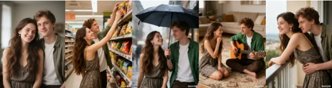 Seedream 4.0 能够在严格遵循人物外观一致性的基础上,设计出超市购物、雨中撑伞等浪漫场景。这种输出方式避免了传统生成模型常见的形象漂移问题,让用户得到一整套故事化的图像。