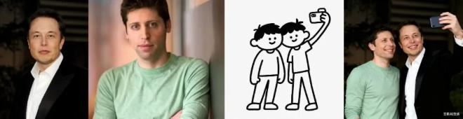 我们上传了马斯克、奥特曼这对劲敌的半身照,以及一张手绘自拍动作参考图,并在提示词中指定将两位人物合并到同一画面,完成一张「世纪大和解」的自拍照。