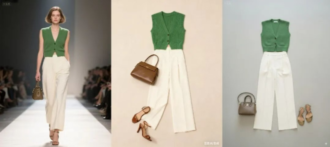 这两款模型都能够严格遵循提示词要求,将参考穿搭准确替换到模特身上,整体效果自然,服装细节和轮廓基本与参考图一致。