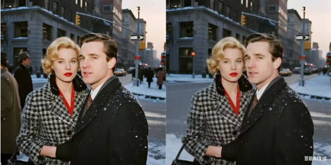 二者实力几乎不相上下,Seedream 4.0 的成片更清晰,人物面部轮廓与背景纹理表现得更加锐利; Nano Banana 的颗粒感更强,也更有老照片的味道。