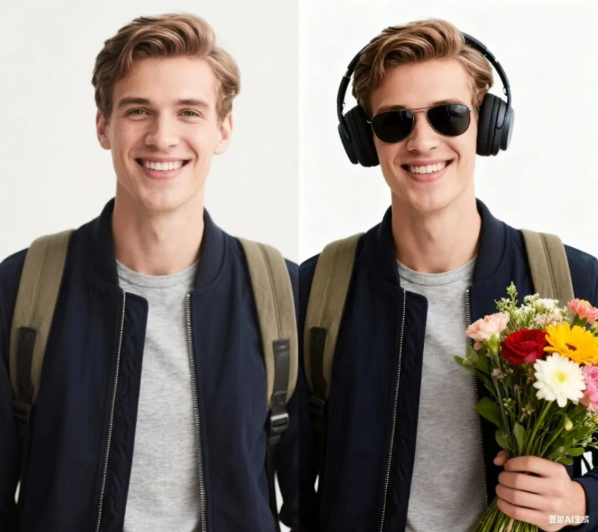 比如让男生戴上耳机和墨镜,并手捧一束花,模型自然完成了三项元素的添加。耳机、墨镜与花束都与人物形象高度契合,整体效果真实自然。