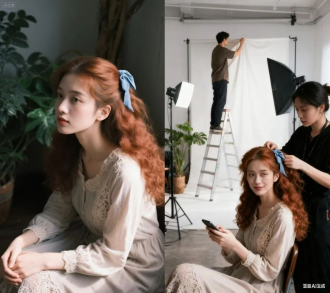 提示词:展示布景搭建的场景,模特坐着滑手机,身后有一位女性正在帮她整理头发,背景里有一名男子站在梯子上挂幕布,幕布后露出摄影棚的环境