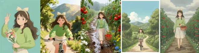 我们以一张吉卜力风格的女孩形象为参考,要求模型延展出两组治愈系场景。