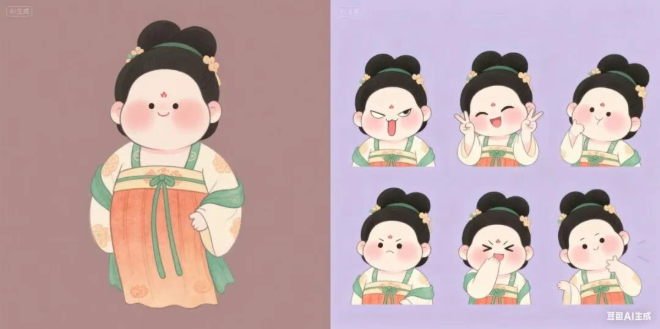 我们还可以制作表情包,Seedream 4.0 忠实还原了仕女的服饰与造型特色,并充分发挥想象力,生成扮鬼脸、打哈欠、比耶、愤怒等多款生动表情,角色形象和画风均没有走样。