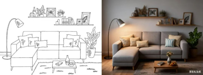 我们上传了一张室内设计的线稿图,并要求将其改造成真实场景。模型实现了细节上的高度还原,从沙发、桌子、台灯等主要家具,到画框、绿植等小型装饰,都能做到几乎 1:1 的精准复刻。