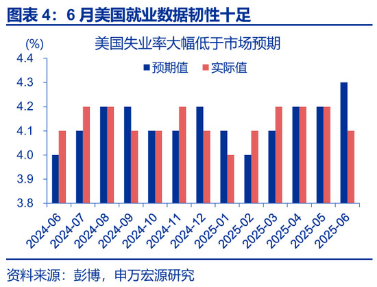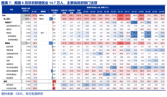 然而美国经济数据总量向好,却难掩结构性隐忧,关税的经济效应或“虽迟但到”。一方面,低预期的通胀数据主要由两方面因素所致,1)关税实际征收进度较慢,美国4月仅为5.7%、低于5月12日关税降级后的理论平均关税税率;2)前期超额累库,使得美国企业依靠存量“便宜”库存,以及“抢进口”消费品,可以推迟涨价。但这些因素仅在“递延”关税效应、而非使之消失。另一方面,就业超预期因素来自于政府部门,占6月整体新增就业人数一半;而私营部门就业、平均时薪增速均低于市场预期,失业率“流量”数据也显示,美国就业市场“需求侧”正在走弱。