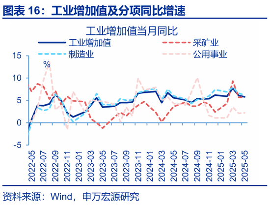结构上,制造业景气或趋于弱化,服务业景气并不弱。1)设备更新的周期正逐步进入退坡期。5月固定投资当月同比回落0.7pct至2.8%,分结构看,5月设备购置(-1.9pct至14.8%)与制造业投资增速(-0.4pct至7.7%)均继续回落。2)出口链生产边际走弱。5月工业增加值的中游生产主要受出口回落拖累,运输设备(-3pct至14.6%)、电气机械(-2.4pct至11%)、纺织(-2.3pct至0.6%)等行业生产降幅较大。3)企业预期明显走弱,6月企业预期指数却下行至2023年最低水平(52%)。服务业PMI虽小幅下滑,但更多是假日效应消退,生活性服务业景气回落。