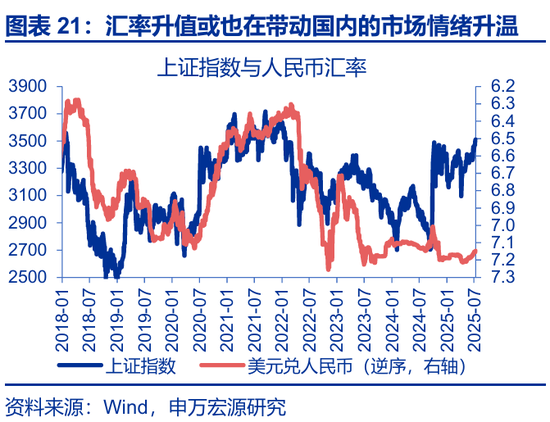 此外,政策利好的加码与外部扰动的缓和,也创造了比较有利的市场环境。一方面,金融对外开放等政策进一步提振了市场情绪。另一方面,中美间的贸易谈判仍在延续,近期特朗普针对部分经济体提高关税税率、但对中国未再加码;同时,弱美元背景下,人民币汇率也逐步走强。