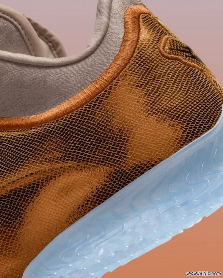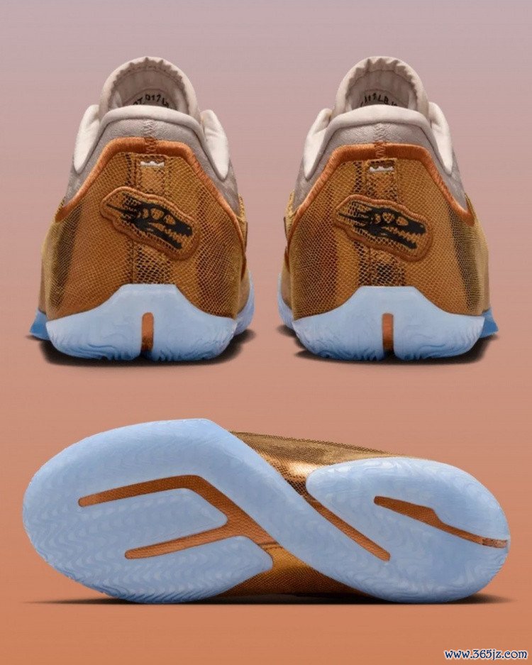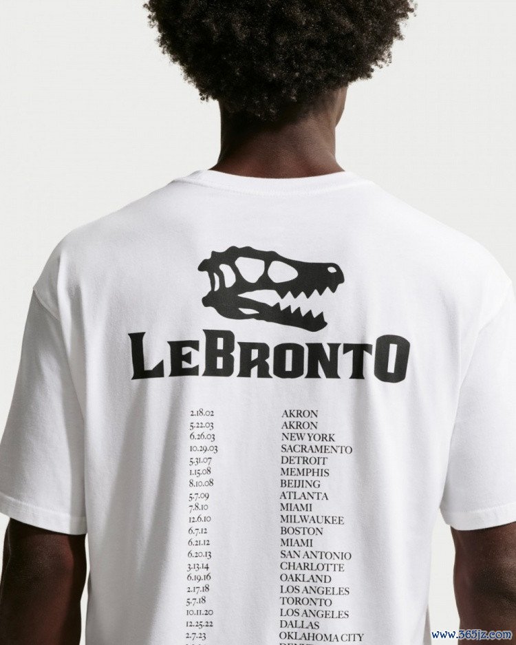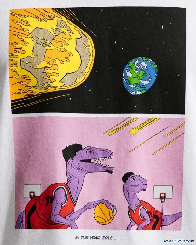 该配色球鞋后跟处也有一个恐龙头骨的形象类比猛龙队,同时同主题的T恤有一个“2018年‘猛龙’灭绝”的设计。