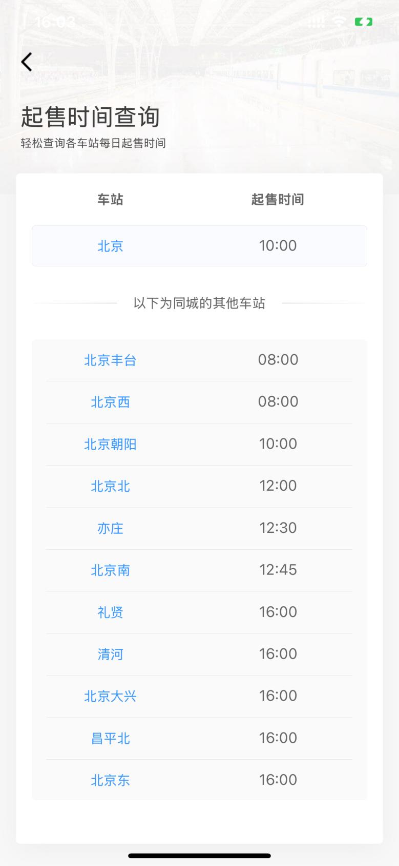 需要注意的是,不同火车站车票起售时间不同:假设从北京出发,北京丰台站、北京西站起售时间为8点,北京站、北京朝阳站为10点,北京北站为12点,亦庄站为12点30分,北京南站为12点45分,礼贤站、清河站、北京大兴站、昌平北站、北京东站为16点。定闹钟抢票可要看准时间!